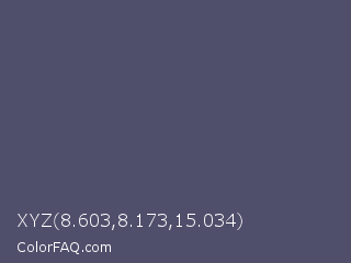 XYZ 8.603,8.173,15.034 Color is a normal indigo color and the nearest color is Independence #4c516d. Hex code #4f4e6b and RGB value is rgb(79,78,107). In RGB color space, this color is composed of 31% red, 31% green, 42% blue, In CMYK color space, this color is composed of 26% cyan, 27% magenta, 0% yellow , 58% black , In HSL color space, this color has a hue angle of 242° , 16% saturation and 36% lightness.