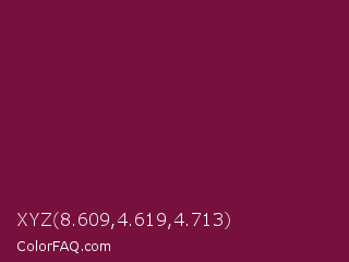 XYZ 8.609,4.619,4.713 Color is a dark rose color and the nearest color is Claret #7f1734. Hex code #77103c and RGB value is rgb(119,16,60). In RGB color space, this color is composed of 47% red, 6% green, 24% blue, In CMYK color space, this color is composed of 0% cyan, 87% magenta, 50% yellow , 53% black , In HSL color space, this color has a hue angle of 334° , 76% saturation and 26% lightness.