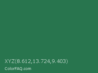 XYZ 8.612,13.724,9.403 Color is a normal green color and the nearest color is Dark Spring Green #177245. Hex code #28754e and RGB value is rgb(40,117,78). In RGB color space, this color is composed of 16% red, 46% green, 31% blue, In CMYK color space, this color is composed of 66% cyan, 0% magenta, 33% yellow , 54% black , In HSL color space, this color has a hue angle of 150° , 49% saturation and 31% lightness.