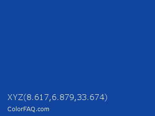 XYZ 8.617,6.879,33.674 Color is a normal blue color and the nearest color is Yale Blue #0f4d92. Hex code #11459f and RGB value is rgb(17,69,159). In RGB color space, this color is composed of 7% red, 27% green, 62% blue, In CMYK color space, this color is composed of 89% cyan, 57% magenta, 0% yellow , 38% black , In HSL color space, this color has a hue angle of 218° , 81% saturation and 35% lightness.
