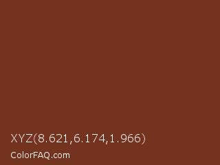 XYZ 8.621,6.174,1.966 Color is a dark color and the nearest color is Mocha #782d19. Hex code #74331e and RGB value is rgb(116,51,30). In RGB color space, this color is composed of 45% red, 20% green, 12% blue, In CMYK color space, this color is composed of 0% cyan, 56% magenta, 74% yellow , 55% black , In HSL color space, this color has a hue angle of 15° , 59% saturation and 29% lightness.