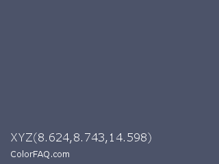 XYZ 8.624,8.743,14.598 Color is a normal blue color and the nearest color is Independence #4c516d. Hex code #4c5369 and RGB value is rgb(76,83,105). In RGB color space, this color is composed of 30% red, 33% green, 41% blue, In CMYK color space, this color is composed of 28% cyan, 21% magenta, 0% yellow , 59% black , In HSL color space, this color has a hue angle of 226° , 16% saturation and 35% lightness.