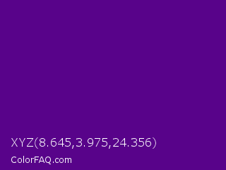 XYZ 8.645,3.975,24.356 Color is a dark purple color and the nearest color is Pigment Indigo #4b0082. Hex code #58038a and RGB value is rgb(88,3,138). In RGB color space, this color is composed of 35% red, 1% green, 54% blue, In CMYK color space, this color is composed of 36% cyan, 98% magenta, 0% yellow , 46% black , In HSL color space, this color has a hue angle of 278° , 96% saturation and 28% lightness.