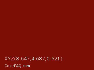 XYZ 8.647,4.687,0.621 Color is a dark red color and the nearest color is Barn Red #7c0a02. Hex code #7d0e06 and RGB value is rgb(125,14,6). In RGB color space, this color is composed of 49% red, 5% green, 2% blue, In CMYK color space, this color is composed of 0% cyan, 89% magenta, 95% yellow , 51% black , In HSL color space, this color has a hue angle of 4° , 91% saturation and 26% lightness.