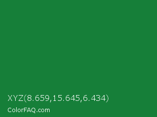 XYZ 8.659,15.645,6.434 Color is a dark green color and the nearest color is Dark Spring Green #177245. Hex code #167f39 and RGB value is rgb(22,127,57). In RGB color space, this color is composed of 9% red, 50% green, 22% blue, In CMYK color space, this color is composed of 83% cyan, 0% magenta, 55% yellow , 50% black , In HSL color space, this color has a hue angle of 140° , 70% saturation and 29% lightness.