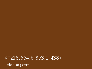 XYZ 8.664,6.853,1.438 Color is a dark orange color and the nearest color is Sepia #704214. Hex code #723c12 and RGB value is rgb(114,60,18). In RGB color space, this color is composed of 45% red, 24% green, 7% blue, In CMYK color space, this color is composed of 0% cyan, 47% magenta, 84% yellow , 55% black , In HSL color space, this color has a hue angle of 26° , 73% saturation and 26% lightness.
