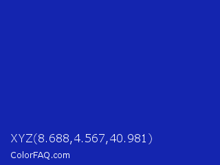 XYZ 8.688,4.567,40.981 Color is a normal blue color and the nearest color is Egyptian Blue #1034a6. Hex code #1425af and RGB value is rgb(20,37,175). In RGB color space, this color is composed of 8% red, 15% green, 69% blue, In CMYK color space, this color is composed of 89% cyan, 79% magenta, 0% yellow , 31% black , In HSL color space, this color has a hue angle of 233° , 79% saturation and 38% lightness.