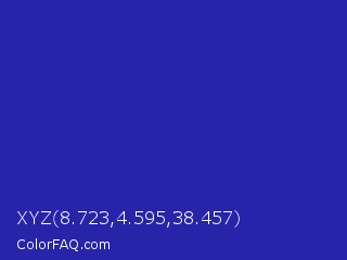 XYZ 8.723,4.595,38.457 Color is a normal indigo color and the nearest color is Blue Pigment #333399. Hex code #2724aa and RGB value is rgb(39,36,170). In RGB color space, this color is composed of 15% red, 14% green, 67% blue, In CMYK color space, this color is composed of 77% cyan, 79% magenta, 0% yellow , 33% black , In HSL color space, this color has a hue angle of 241° , 65% saturation and 40% lightness.
