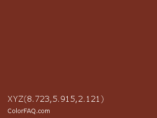 XYZ 8.723,5.915,2.121 Color is a dark red color and the nearest color is Metallic Copper #71291d. Hex code #762e21 and RGB value is rgb(118,46,33). In RGB color space, this color is composed of 46% red, 18% green, 13% blue, In CMYK color space, this color is composed of 0% cyan, 61% magenta, 72% yellow , 54% black , In HSL color space, this color has a hue angle of 9° , 56% saturation and 30% lightness.