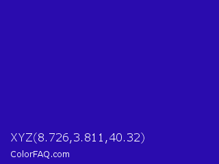XYZ 8.726,3.811,40.32 Color is a normal indigo color and the nearest color is Interdimensional Blue #360ccc. Hex code #2a0cae and RGB value is rgb(42,12,174). In RGB color space, this color is composed of 16% red, 5% green, 68% blue, In CMYK color space, this color is composed of 76% cyan, 93% magenta, 0% yellow , 32% black , In HSL color space, this color has a hue angle of 251° , 87% saturation and 36% lightness.