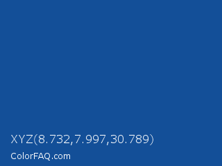 XYZ 8.732,7.997,30.789 Color is a normal blue color and the nearest color is Yale Blue #0f4d92. Hex code #134f98 and RGB value is rgb(19,79,152). In RGB color space, this color is composed of 7% red, 31% green, 60% blue, In CMYK color space, this color is composed of 88% cyan, 48% magenta, 0% yellow , 40% black , In HSL color space, this color has a hue angle of 213° , 78% saturation and 34% lightness.
