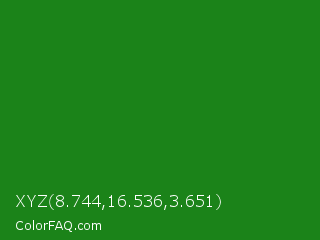 XYZ 8.744,16.536,3.651 Color is a normal green color and the nearest color is Forest Green #228b22. Hex code #1b8319 and RGB value is rgb(27,131,25). In RGB color space, this color is composed of 11% red, 51% green, 10% blue, In CMYK color space, this color is composed of 79% cyan, 0% magenta, 81% yellow , 49% black , In HSL color space, this color has a hue angle of 119° , 68% saturation and 31% lightness.