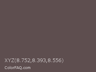XYZ 8.752,8.393,8.556 Color is a normal red color and the nearest color is Don Juan #5d4c51. Hex code #5e4e4f and RGB value is rgb(94,78,79). In RGB color space, this color is composed of 37% red, 31% green, 31% blue, In CMYK color space, this color is composed of 0% cyan, 17% magenta, 16% yellow , 63% black , In HSL color space, this color has a hue angle of 356° , 9% saturation and 34% lightness.
