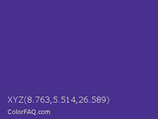 XYZ 8.763,5.514,26.589 Color is a normal indigo color and the nearest color is KSU Purple #512888. Hex code #49308f and RGB value is rgb(73,48,143). In RGB color space, this color is composed of 29% red, 19% green, 56% blue, In CMYK color space, this color is composed of 49% cyan, 66% magenta, 0% yellow , 44% black , In HSL color space, this color has a hue angle of 256° , 50% saturation and 37% lightness.