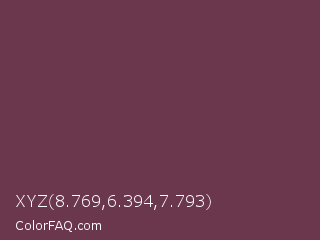 XYZ 8.769,6.394,7.793 Color is a normal rose color and the nearest color is Ube Halaya #663854. Hex code #6b374d and RGB value is rgb(107,55,77). In RGB color space, this color is composed of 42% red, 22% green, 30% blue, In CMYK color space, this color is composed of 0% cyan, 49% magenta, 28% yellow , 58% black , In HSL color space, this color has a hue angle of 335° , 32% saturation and 32% lightness.