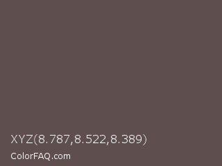 XYZ 8.787,8.522,8.389 Color is a normal red color and the nearest color is Don Juan #5d4c51. Hex code #5e4f4e and RGB value is rgb(94,79,78). In RGB color space, this color is composed of 37% red, 31% green, 31% blue, In CMYK color space, this color is composed of 0% cyan, 16% magenta, 17% yellow , 63% black , In HSL color space, this color has a hue angle of 4° , 9% saturation and 34% lightness.