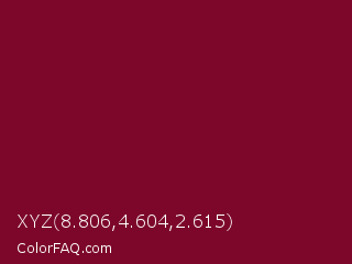 XYZ 8.806,4.604,2.615 Color is a dark rose color and the nearest color is Burgundy #800020. Hex code #7c072a and RGB value is rgb(124,7,42). In RGB color space, this color is composed of 49% red, 3% green, 16% blue, In CMYK color space, this color is composed of 0% cyan, 94% magenta, 66% yellow , 51% black , In HSL color space, this color has a hue angle of 342° , 89% saturation and 26% lightness.