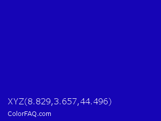 XYZ 8.829,3.657,44.496 Color is a normal indigo color and the nearest color is Dark Blue #0000c8. Hex code #1605b6 and RGB value is rgb(22,5,182). In RGB color space, this color is composed of 9% red, 2% green, 71% blue, In CMYK color space, this color is composed of 88% cyan, 97% magenta, 0% yellow , 29% black , In HSL color space, this color has a hue angle of 246° , 95% saturation and 37% lightness.