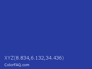 XYZ 8.834,6.132,34.436 Color is a normal blue color and the nearest color is Blue Pigment #333399. Hex code #273ba1 and RGB value is rgb(39,59,161). In RGB color space, this color is composed of 15% red, 23% green, 63% blue, In CMYK color space, this color is composed of 76% cyan, 63% magenta, 0% yellow , 37% black , In HSL color space, this color has a hue angle of 230° , 61% saturation and 39% lightness.