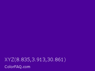 XYZ 8.835,3.913,30.861 Color is a normal violet color and the nearest color is Pigment Indigo #4b0082. Hex code #4c029a and RGB value is rgb(76,2,154). In RGB color space, this color is composed of 30% red, 1% green, 60% blue, In CMYK color space, this color is composed of 51% cyan, 99% magenta, 0% yellow , 40% black , In HSL color space, this color has a hue angle of 269° , 97% saturation and 31% lightness.