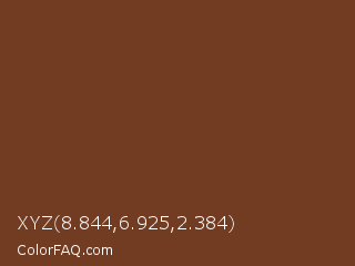 XYZ 8.844,6.925,2.384 Color is a dark orange color and the nearest color is Walnut #773f1a. Hex code #723c22 and RGB value is rgb(114,60,34). In RGB color space, this color is composed of 45% red, 24% green, 13% blue, In CMYK color space, this color is composed of 0% cyan, 47% magenta, 70% yellow , 55% black , In HSL color space, this color has a hue angle of 20° , 54% saturation and 29% lightness.
