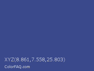 XYZ 8.861,7.558,25.803 Color is a normal blue color and the nearest color is Chambray #354e8c. Hex code #3a498c and RGB value is rgb(58,73,140). In RGB color space, this color is composed of 23% red, 29% green, 55% blue, In CMYK color space, this color is composed of 59% cyan, 48% magenta, 0% yellow , 45% black , In HSL color space, this color has a hue angle of 229° , 41% saturation and 39% lightness.
