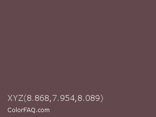 XYZ 8.868,7.954,8.089 Color is a normal red color and the nearest color is Deep Tuscan Red #66424d. Hex code #63494d and RGB value is rgb(99,73,77). In RGB color space, this color is composed of 39% red, 29% green, 30% blue, In CMYK color space, this color is composed of 0% cyan, 26% magenta, 22% yellow , 61% black , In HSL color space, this color has a hue angle of 351° , 15% saturation and 34% lightness.