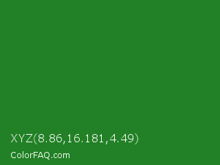 XYZ 8.86,16.181,4.49 Color is a normal green color and the nearest color is Forest Green #228b22. Hex code #228126 and RGB value is rgb(34,129,38). In RGB color space, this color is composed of 13% red, 51% green, 15% blue, In CMYK color space, this color is composed of 74% cyan, 0% magenta, 71% yellow , 49% black , In HSL color space, this color has a hue angle of 123° , 58% saturation and 32% lightness.