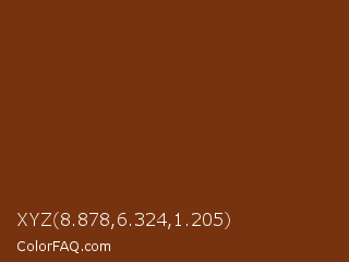 XYZ 8.878,6.324,1.205 Color is a dark orange color and the nearest color is Peanut #782f16. Hex code #77330f and RGB value is rgb(119,51,15). In RGB color space, this color is composed of 47% red, 20% green, 6% blue, In CMYK color space, this color is composed of 0% cyan, 57% magenta, 87% yellow , 53% black , In HSL color space, this color has a hue angle of 21° , 78% saturation and 26% lightness.