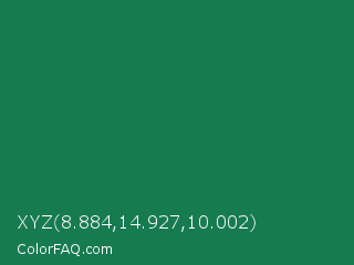 XYZ 8.884,14.927,10.002 Color is a dark green color and the nearest color is Dark Spring Green #177245. Hex code #177b50 and RGB value is rgb(23,123,80). In RGB color space, this color is composed of 9% red, 48% green, 31% blue, In CMYK color space, this color is composed of 81% cyan, 0% magenta, 35% yellow , 52% black , In HSL color space, this color has a hue angle of 154° , 68% saturation and 29% lightness.