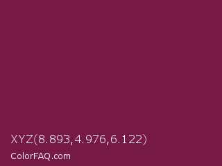 XYZ 8.893,4.976,6.122 Color is a dark rose color and the nearest color is Pansy Purple #78184a. Hex code #761945 and RGB value is rgb(118,25,69). In RGB color space, this color is composed of 46% red, 10% green, 27% blue, In CMYK color space, this color is composed of 0% cyan, 79% magenta, 42% yellow , 54% black , In HSL color space, this color has a hue angle of 332° , 65% saturation and 28% lightness.