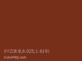 XYZ 8.8,6.025,1.619 Color is a dark red color and the nearest color is Mocha #782d19. Hex code #772f19 and RGB value is rgb(119,47,25). In RGB color space, this color is composed of 47% red, 18% green, 10% blue, In CMYK color space, this color is composed of 0% cyan, 61% magenta, 79% yellow , 53% black , In HSL color space, this color has a hue angle of 14° , 65% saturation and 28% lightness.