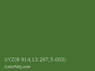 XYZ 8.914,13.297,5.003 Color is a normal green color and the nearest color is Dark Olive Green #556b2f. Hex code #457131 and RGB value is rgb(69,113,49). In RGB color space, this color is composed of 27% red, 44% green, 19% blue, In CMYK color space, this color is composed of 39% cyan, 0% magenta, 57% yellow , 56% black , In HSL color space, this color has a hue angle of 101° , 40% saturation and 32% lightness.