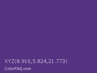 XYZ 8.916,5.824,21.773 Color is a normal violet color and the nearest color is Regalia #522d80. Hex code #553282 and RGB value is rgb(85,50,130). In RGB color space, this color is composed of 33% red, 20% green, 51% blue, In CMYK color space, this color is composed of 35% cyan, 62% magenta, 0% yellow , 49% black , In HSL color space, this color has a hue angle of 266° , 44% saturation and 35% lightness.