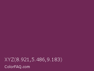 XYZ 8.921,5.486,9.183 Color is a dark magenta color and the nearest color is Finn #692d54. Hex code #6f2755 and RGB value is rgb(111,39,85). In RGB color space, this color is composed of 44% red, 15% green, 33% blue, In CMYK color space, this color is composed of 0% cyan, 65% magenta, 23% yellow , 56% black , In HSL color space, this color has a hue angle of 322° , 48% saturation and 29% lightness.