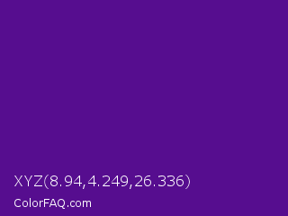XYZ 8.94,4.249,26.336 Color is a normal purple color and the nearest color is Pigment Indigo #4b0082. Hex code #560d8f and RGB value is rgb(86,13,143). In RGB color space, this color is composed of 34% red, 5% green, 56% blue, In CMYK color space, this color is composed of 40% cyan, 91% magenta, 0% yellow , 44% black , In HSL color space, this color has a hue angle of 274° , 83% saturation and 31% lightness.