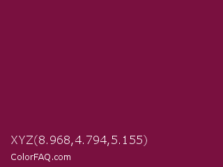 XYZ 8.968,4.794,5.155 Color is a dark rose color and the nearest color is Rose Bud Cherry #800b47. Hex code #79103f and RGB value is rgb(121,16,63). In RGB color space, this color is composed of 47% red, 6% green, 25% blue, In CMYK color space, this color is composed of 0% cyan, 87% magenta, 48% yellow , 53% black , In HSL color space, this color has a hue angle of 333° , 77% saturation and 27% lightness.