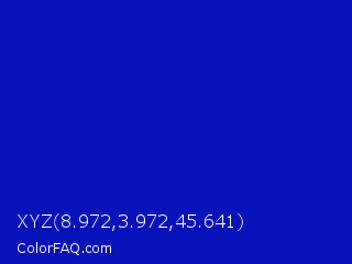 XYZ 8.972,3.972,45.641 Color is a normal blue color and the nearest color is Zaffre #0014a8. Hex code #0713b8 and RGB value is rgb(7,19,184). In RGB color space, this color is composed of 3% red, 7% green, 72% blue, In CMYK color space, this color is composed of 96% cyan, 90% magenta, 0% yellow , 28% black , In HSL color space, this color has a hue angle of 236° , 93% saturation and 37% lightness.