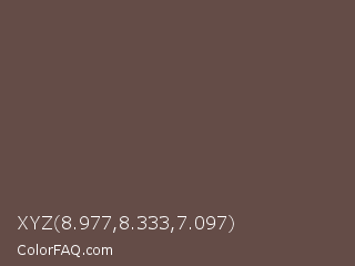 XYZ 8.977,8.333,7.097 Color is a normal red color and the nearest color is Medium Taupe #674c47. Hex code #644c47 and RGB value is rgb(100,76,71). In RGB color space, this color is composed of 39% red, 30% green, 28% blue, In CMYK color space, this color is composed of 0% cyan, 24% magenta, 29% yellow , 61% black , In HSL color space, this color has a hue angle of 10° , 17% saturation and 34% lightness.