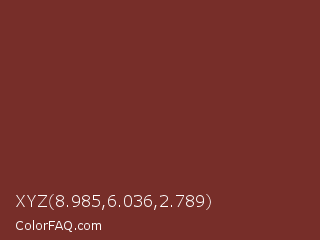 XYZ 8.985,6.036,2.789 Color is a normal red color and the nearest color is Metallic Copper #71291d. Hex code #772e29 and RGB value is rgb(119,46,41). In RGB color space, this color is composed of 47% red, 18% green, 16% blue, In CMYK color space, this color is composed of 0% cyan, 61% magenta, 66% yellow , 53% black , In HSL color space, this color has a hue angle of 4° , 49% saturation and 31% lightness.