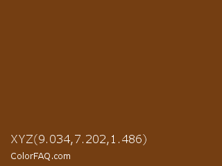XYZ 9.034,7.202,1.486 Color is a dark orange color and the nearest color is Sepia #704214. Hex code #743e12 and RGB value is rgb(116,62,18). In RGB color space, this color is composed of 45% red, 24% green, 7% blue, In CMYK color space, this color is composed of 0% cyan, 47% magenta, 84% yellow , 55% black , In HSL color space, this color has a hue angle of 27° , 73% saturation and 26% lightness.