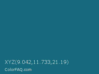 XYZ 9.042,11.733,21.19 Color is a dark cyan color and the nearest color is Blue Sapphire #126180. Hex code #14697d and RGB value is rgb(20,105,125). In RGB color space, this color is composed of 8% red, 41% green, 49% blue, In CMYK color space, this color is composed of 84% cyan, 16% magenta, 0% yellow , 51% black , In HSL color space, this color has a hue angle of 191° , 72% saturation and 28% lightness.