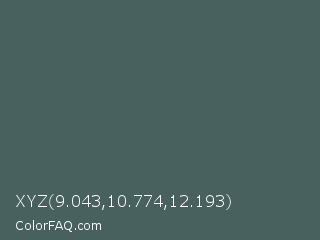 XYZ 9.043,10.774,12.193 Color is a normal cyan color and the nearest color is Feldgrau #4d5d53. Hex code #49615e and RGB value is rgb(73,97,94). In RGB color space, this color is composed of 29% red, 38% green, 37% blue, In CMYK color space, this color is composed of 25% cyan, 0% magenta, 3% yellow , 62% black , In HSL color space, this color has a hue angle of 173° , 14% saturation and 33% lightness.