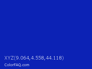 XYZ 9.064,4.558,44.118 Color is a normal blue color and the nearest color is Blue Pantone #0018a8. Hex code #0c22b5 and RGB value is rgb(12,34,181). In RGB color space, this color is composed of 5% red, 13% green, 71% blue, In CMYK color space, this color is composed of 93% cyan, 81% magenta, 0% yellow , 29% black , In HSL color space, this color has a hue angle of 232° , 88% saturation and 38% lightness.