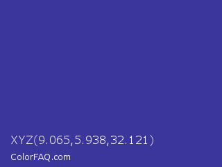 XYZ 9.065,5.938,32.121 Color is a normal indigo color and the nearest color is Blue Pigment #333399. Hex code #3a369c and RGB value is rgb(58,54,156). In RGB color space, this color is composed of 23% red, 21% green, 61% blue, In CMYK color space, this color is composed of 63% cyan, 65% magenta, 0% yellow , 39% black , In HSL color space, this color has a hue angle of 242° , 49% saturation and 41% lightness.