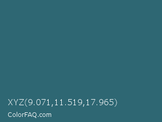 XYZ 9.071,11.519,17.965 Color is a normal cyan color and the nearest color is Casal #2f6168. Hex code #2e6773 and RGB value is rgb(46,103,115). In RGB color space, this color is composed of 18% red, 40% green, 45% blue, In CMYK color space, this color is composed of 60% cyan, 10% magenta, 0% yellow , 55% black , In HSL color space, this color has a hue angle of 190° , 43% saturation and 32% lightness.