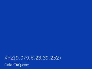 XYZ 9.079,6.23,39.252 Color is a normal blue color and the nearest color is Royal Azure #0038a8. Hex code #093cab and RGB value is rgb(9,60,171). In RGB color space, this color is composed of 4% red, 24% green, 67% blue, In CMYK color space, this color is composed of 95% cyan, 65% magenta, 0% yellow , 33% black , In HSL color space, this color has a hue angle of 221° , 90% saturation and 35% lightness.