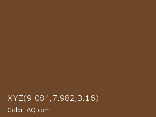 XYZ 9.084,7.982,3.16 Color is a dark orange color and the nearest color is Pickled Bean #6e4826. Hex code #6e4729 and RGB value is rgb(110,71,41). In RGB color space, this color is composed of 43% red, 28% green, 16% blue, In CMYK color space, this color is composed of 0% cyan, 35% magenta, 63% yellow , 57% black , In HSL color space, this color has a hue angle of 26° , 46% saturation and 30% lightness.