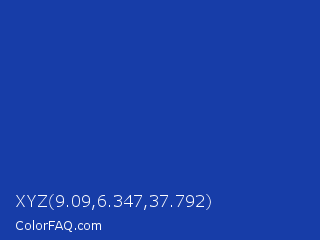 XYZ 9.09,6.347,37.792 Color is a normal blue color and the nearest color is Egyptian Blue #1034a6. Hex code #173da8 and RGB value is rgb(23,61,168). In RGB color space, this color is composed of 9% red, 24% green, 66% blue, In CMYK color space, this color is composed of 86% cyan, 64% magenta, 0% yellow , 34% black , In HSL color space, this color has a hue angle of 224° , 76% saturation and 37% lightness.