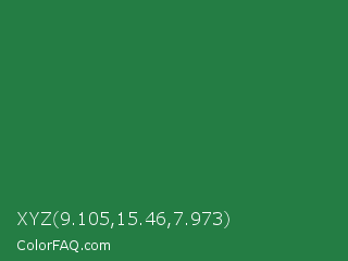 XYZ 9.105,15.46,7.973 Color is a normal green color and the nearest color is Dark Spring Green #177245. Hex code #247d44 and RGB value is rgb(36,125,68). In RGB color space, this color is composed of 14% red, 49% green, 27% blue, In CMYK color space, this color is composed of 71% cyan, 0% magenta, 46% yellow , 51% black , In HSL color space, this color has a hue angle of 142° , 55% saturation and 32% lightness.